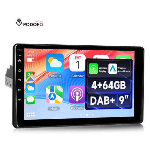 Podofo Android 1 Dinカーオーディオ4 + 64GB取り外し可能9インチカーラジオ調整可能IPSスクリーンシングルDin CarPlay/AI Voice/DAB +/BT/GPS